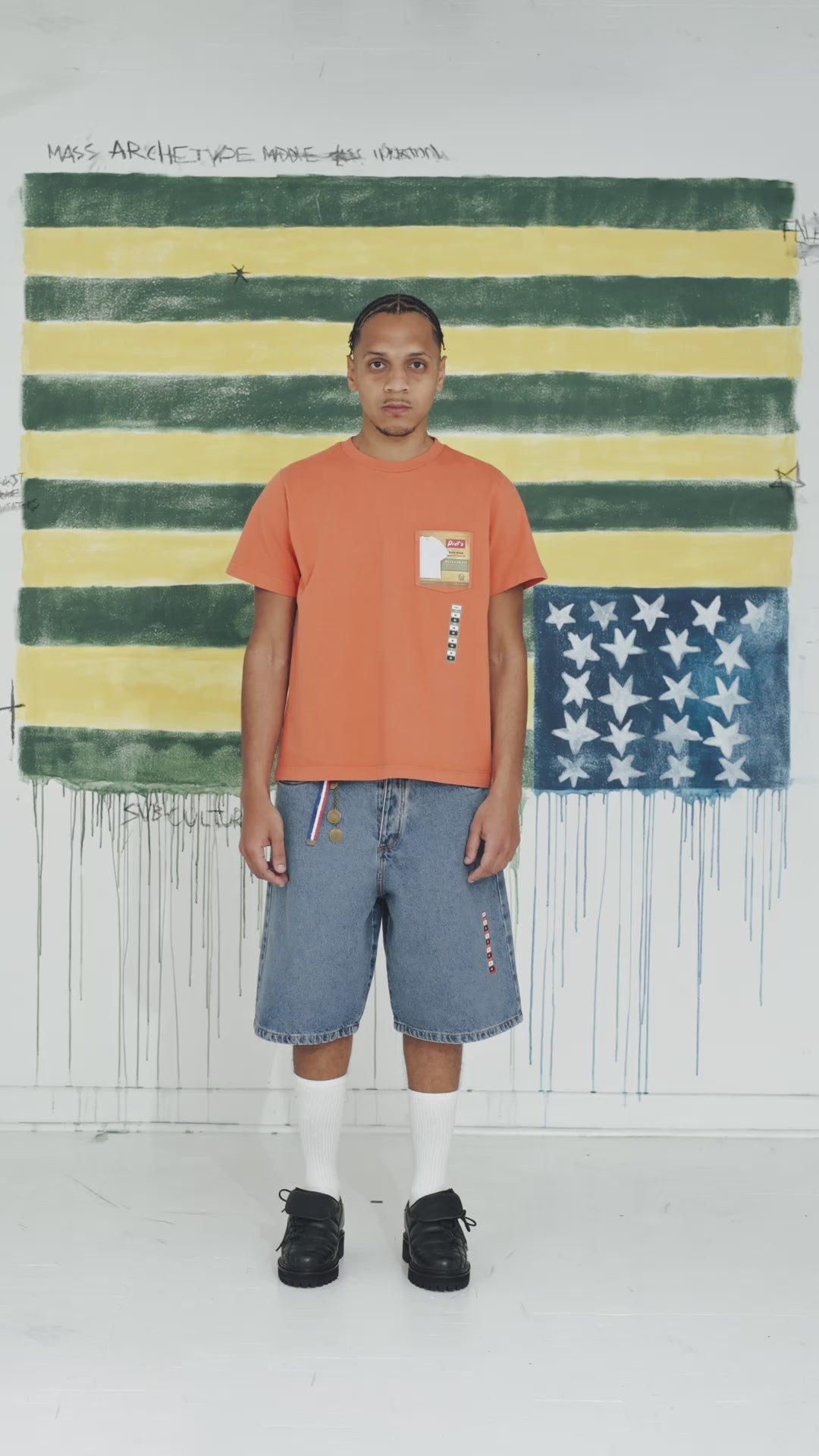 A bermuda Brand New Shorts é confeccionada em denim 100% algodão 11Oz. Com modelagem oversized, 5 pockets, a peça é detalhada com estampas que imitam etiquetas adesivas. Possui fechamento frontal com botões e rebites personalizados.