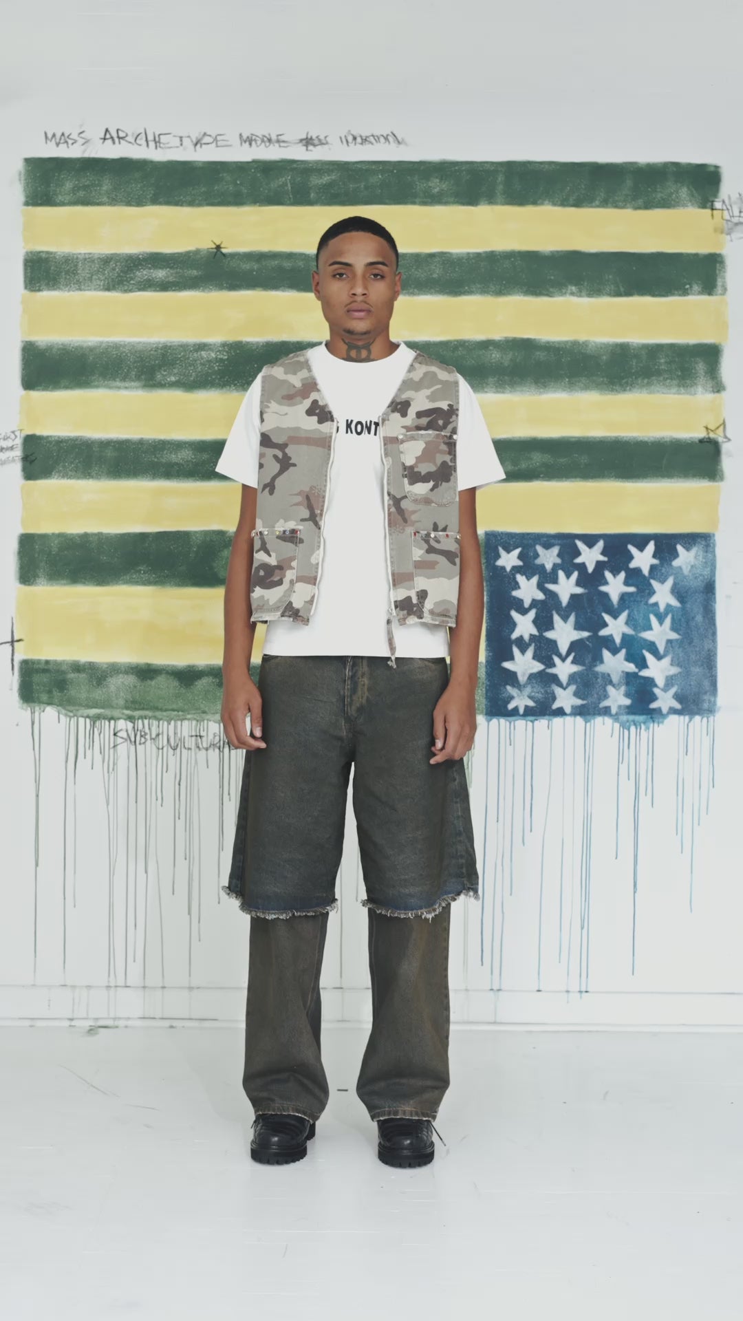O Camo Vest with Swarovski Crystals é confeccionado em sarja 100% algodão. Possui três bolsos na parte frontal, onde os inferiores carregam aplicação de rebites cristais Swarovski. Apresenta um pequeno bordado na parte das costas, rebites personalizados e zíper.