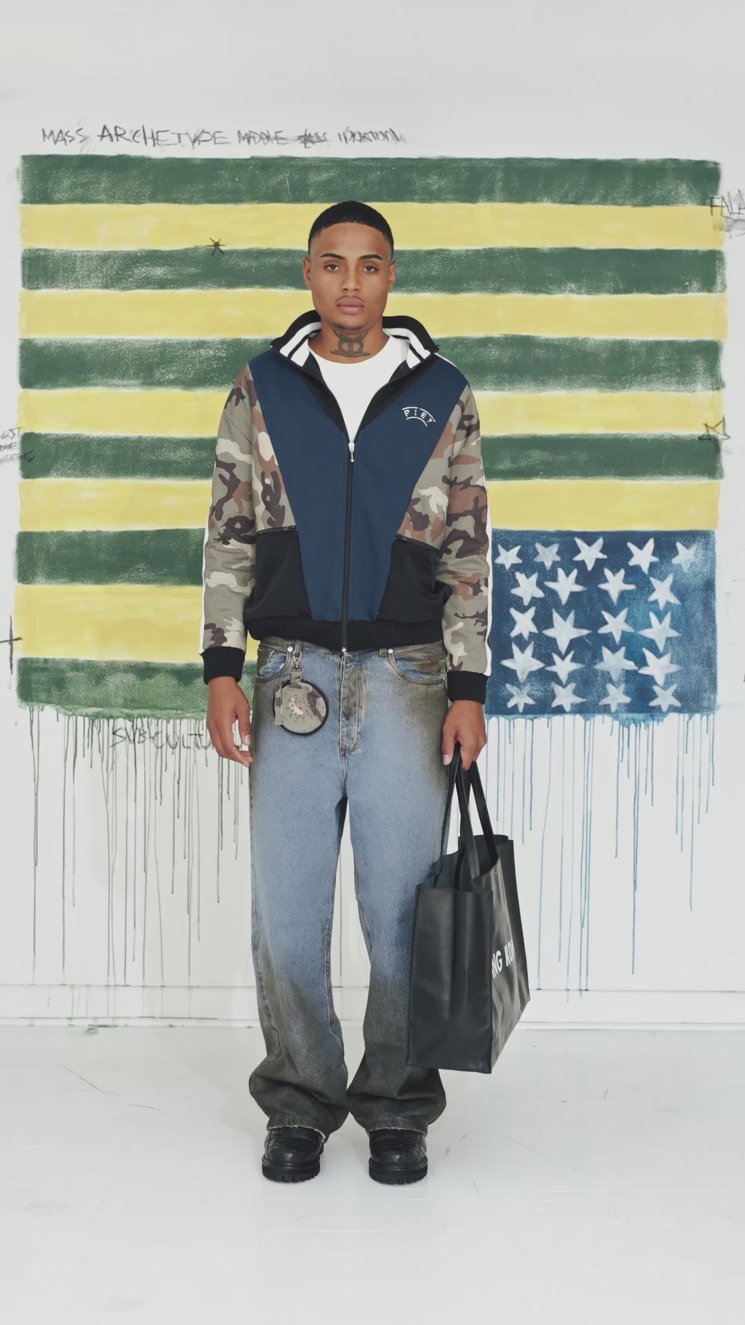 Esta peça apresenta aspecto vintage, com pequenos puídos nos bolsos e barras, etiquetas e rebites personalizados.