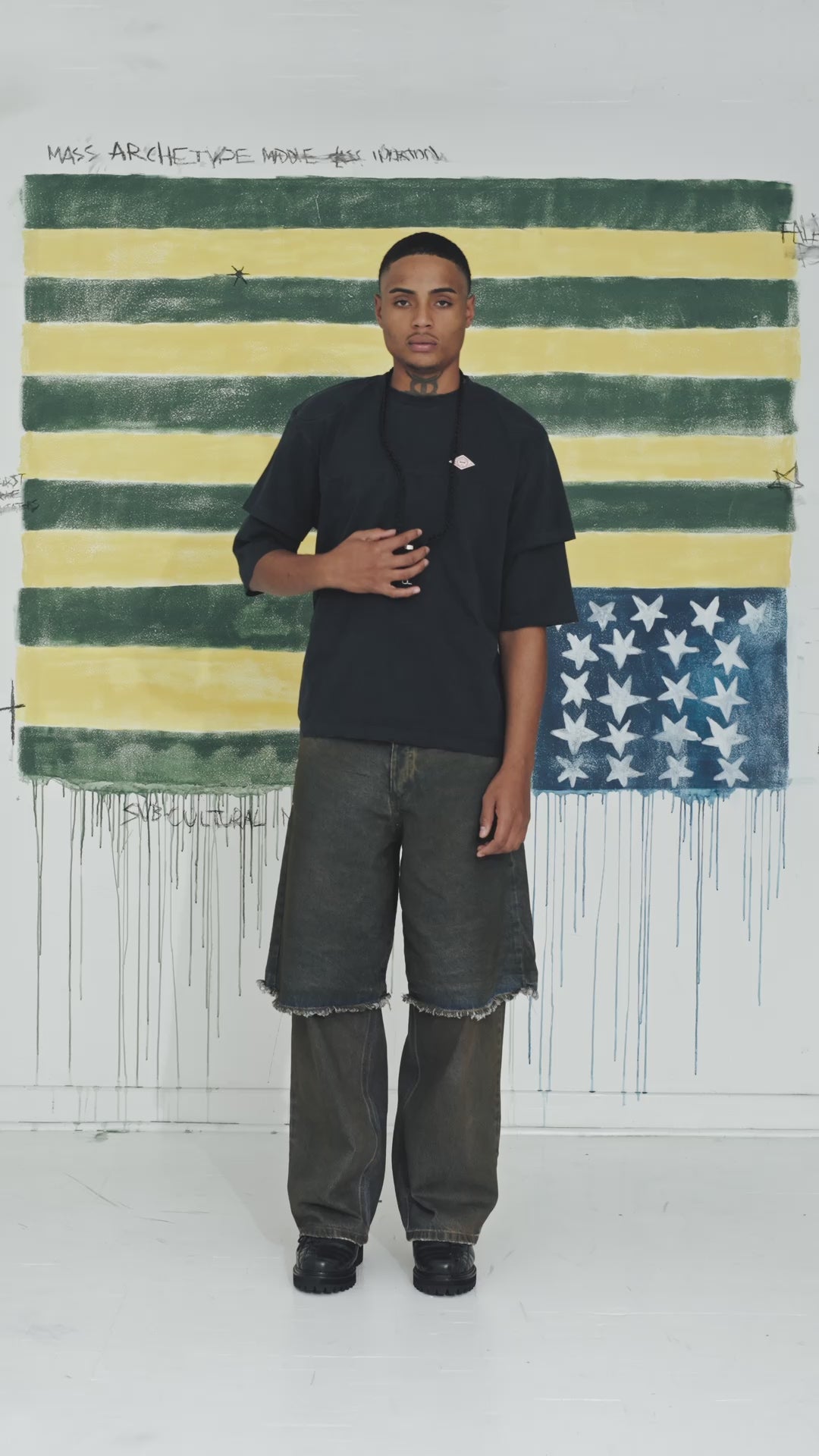 A Double Sleeve T-shirt é confeccionada em malha 100% algodão de 270 GSM pré encolhida, com lavagem que oferece efeito estonado. A peça conta com mangas duplas e ombreiras finas, inspiradas em camisas de goleiro. Possui gola de 2,5 cm. Apresenta estampa e etiqueta PIET Union Made na frente. Possui puídos na gola, barra e mangas.