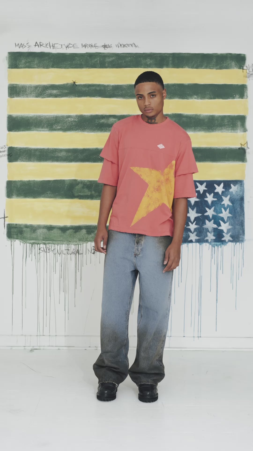 A Double Sleeve T-shirt é confeccionada em malha 100% algodão de 270 GSM pré encolhida, com lavagem que oferece efeito estonado. A peça conta com mangas duplas e ombreiras finas, inspiradas em camisas de goleiro. Possui gola de 2,5 cm. Apresenta estampa e etiqueta PIET Union Made na frente. Possui puídos na gola, barra e mangas.