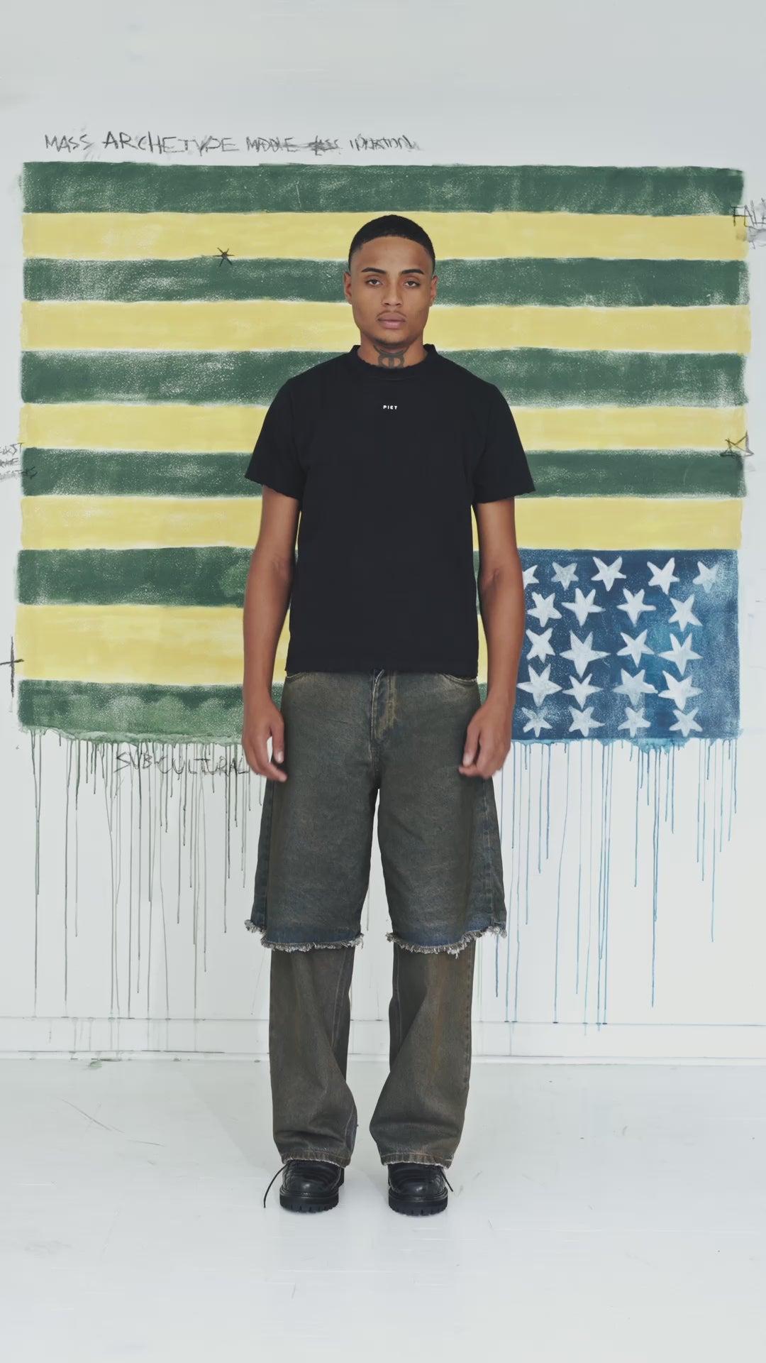 A Logo T-Shirt é confeccionada em malha 100% algodão de 270 GSM pré encolhida. Sua modelagem regular oferece um caimento mais ajustado, com costura alinhada ao ombro e gola de 2,5 cm. Apresenta uma pequena estampa na parte da frente e uma pedra turquesa perto da gola nas costas. A peça possui tingimento estonado e puídos na gola, barra e mangas.