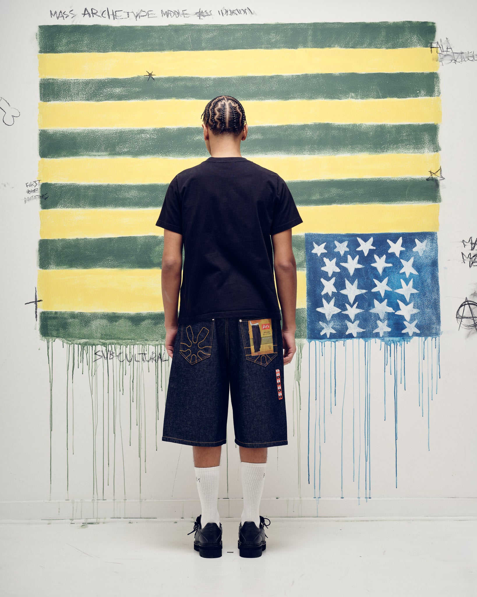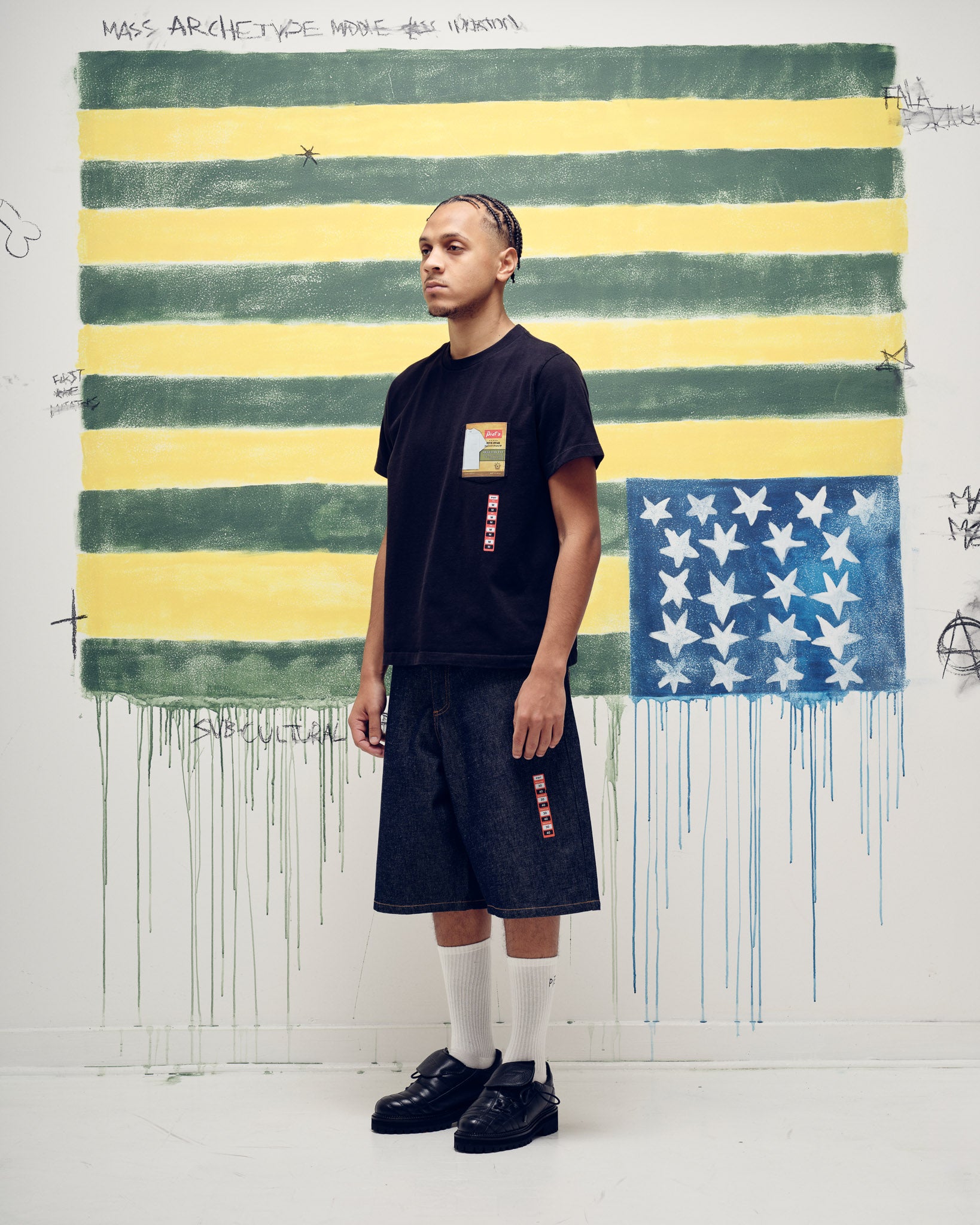 A bermuda Brand New Shorts é confeccionada em denim 100% algodão 11Oz. Com modelagem oversized, 5 pockets, a peça é detalhada com estampas que imitam etiquetas adesivas. Possui fechamento frontal com botões e rebites personalizados.