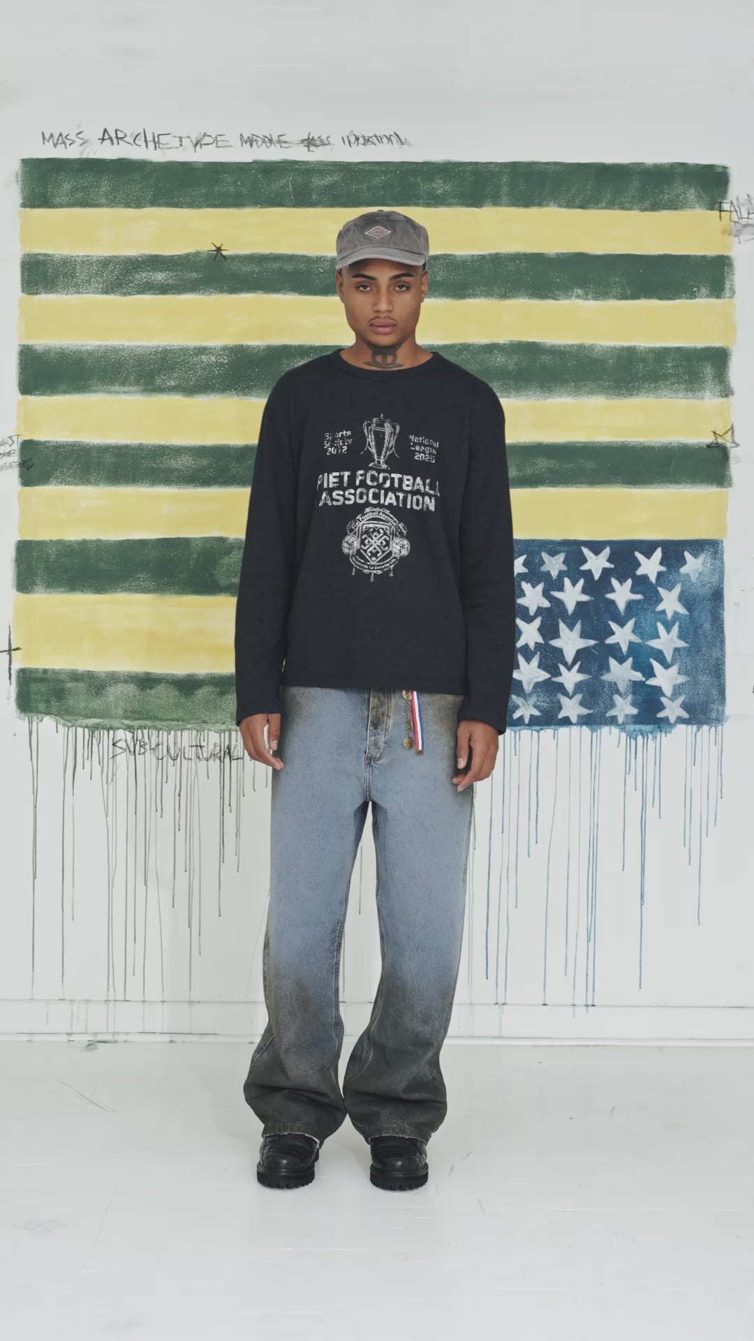 A Football Association Long Sleeve T-shirt é confeccionada em malha texturizada pré-encolhida. Apresenta estampa em silk desgastada na frente. Possui puídos na gola, barra e mangas.