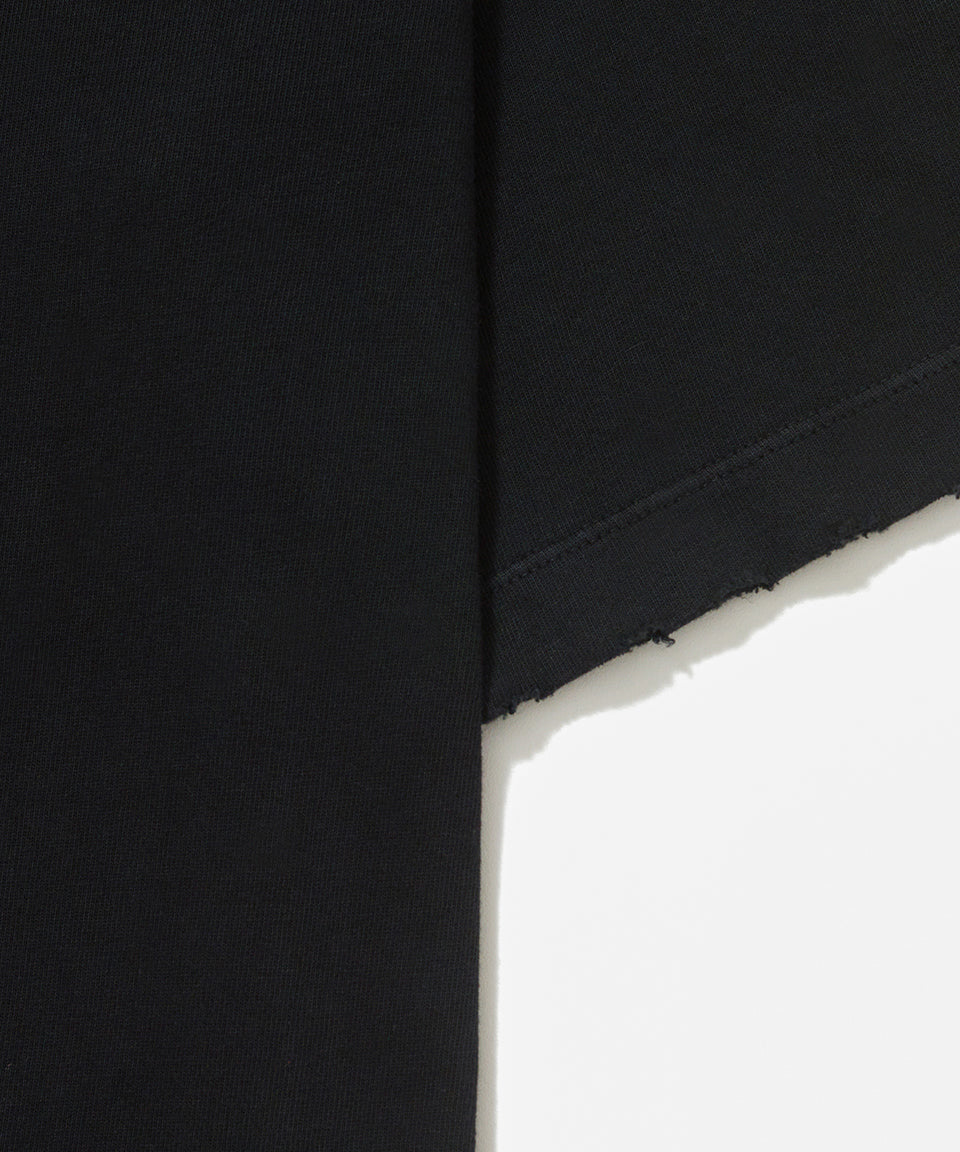 A Logo T-Shirt é confeccionada em malha 100% algodão de 270 GSM pré encolhida. Sua modelagem regular oferece um caimento mais ajustado, com costura alinhada ao ombro e gola de 2,5 cm. Apresenta uma pequena estampa na parte da frente e uma pedra turquesa perto da gola nas costas. A peça possui tingimento estonado e puídos na gola, barra e mangas.