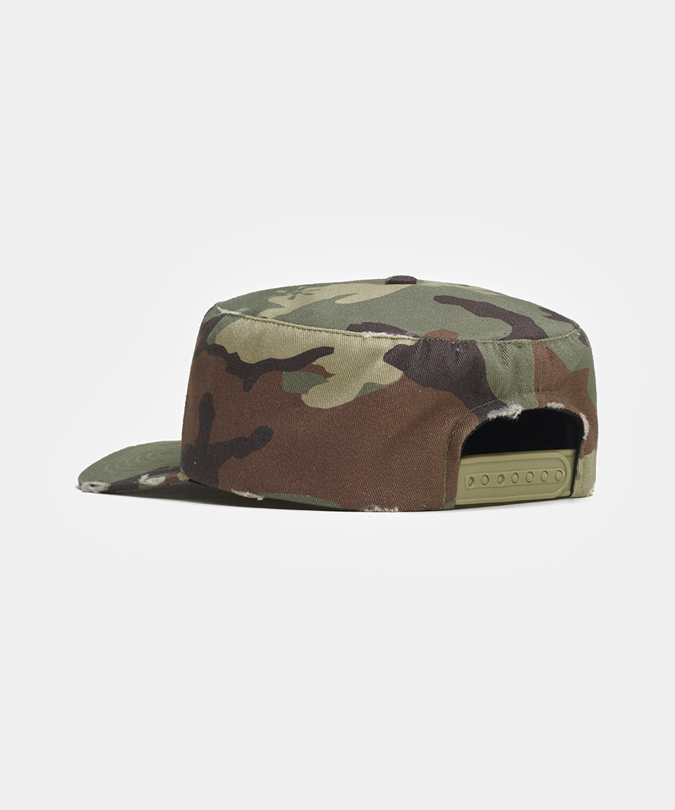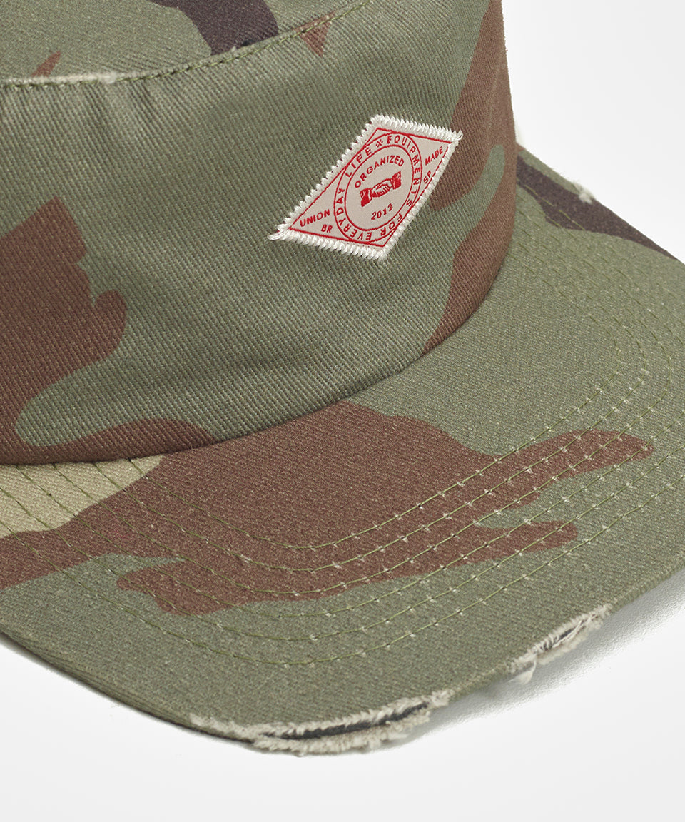 O Distressed Cap é confeccionado em sarja 100% algodão. Apresenta uma estampa camuflada exclusiva PIET. Com etiqueta Union Made na frente e fechamento snapback, oferece praticidade. Possui puídos e desgastes feitos artesanalmente.