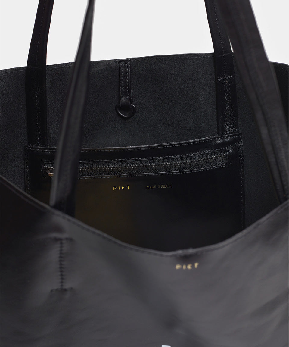 A Doping Kontrolle Leather Tote Bag é confeccionada em couro, possui estampa em um dos lados e conta com um bolso interno fechado por zíper de metal, oferecendo praticidade. O logo PIET é gravado em dourado, adicionando um toque exclusivo à peça.
